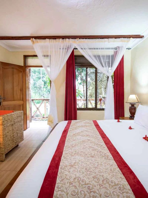 There are 10 Standard pool facing cabanas with partial crater views. All rooms have mosquito nets, wardrobe, clothes rack, shower, bathrobe, free toiletries, toilet, bathroom, bath or shower, outdoor furniture, outdoor dining area, towels, linen, and bedside tables with lamps.